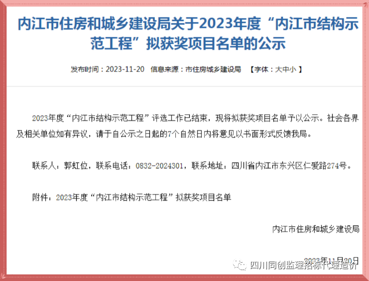近日,內江市住房和城鄉建設局公布了2023年度內江市“結構示范工程”獲獎工程名單,四川同創建設工程管理有限公司監理的“嘉宏.未來方舟項目4#、5#樓”項目榜上有名,這一榮譽不僅是對項目團隊辛勤付出的肯定,也是對四川同創建管監理工作的高度認可。